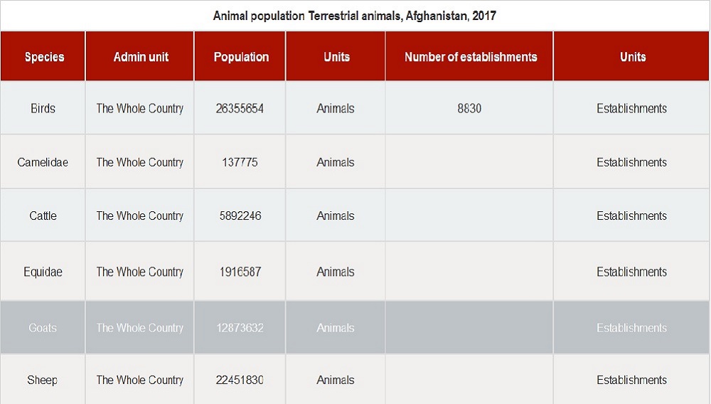 Agriculture is the main source of income in Afghanistan; the country once produced enough food products for its own needs and a surplus for export. However, by 1989 around one-third of the cultivable land had been destroyed by war. The leading crops are wheat, corn, rice, barley, garden vegetables, various fruits, and nuts. The major industrial crops are castor beans, madder (used for red dyes), asafoetida, tobacco, cotton, and sugar beet. Afghanistan is widely regarded as the world’s largest producer of opium, a situation exacerbated by the internal dislocation accompanying civil war. The interim administration has attempted to ban poppy-farming but the UN reported in 2002 that opium production was soaring out of control as Afghanis attempt to produce high-value crops. Sheep-raising, the most important pastoral industry, usually provides large quantities of meat, fats, and wool for domestic consumption and wool and hides for export; there was an estimated 8.80 million head of sheep in 2003. The skin of the karakul, a breed of broadtail sheep raised in large numbers in northern Afghanistan, is highly valued. Livestock also includes substantial numbers of camels, horses, donkeys, cattle, goats, and poultry.